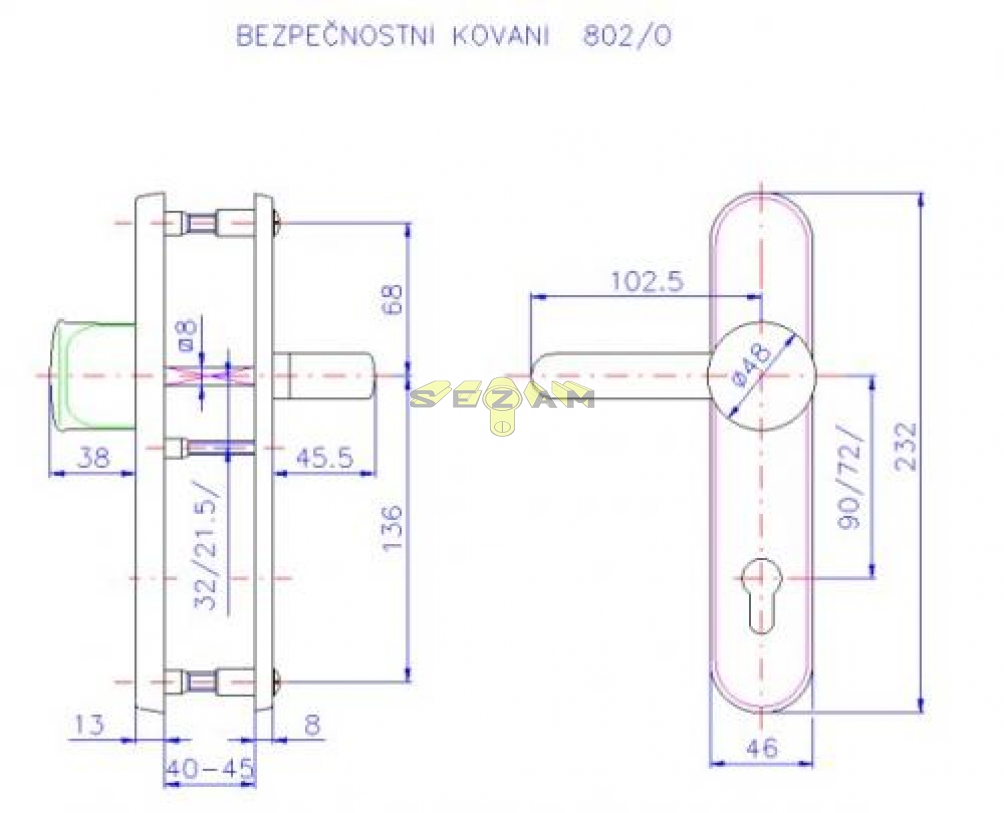 Bezpečnostné kovanie je určené na vstupné dvere otvárané dovnútra i von, hrúbka dverí 38-55 mm, ďalej po 15 mm až do hrúbky dverí 100 mm. Odporúčame použiť cylindrickú vložku v 3. BT odolnú proti odvŕtaniu.