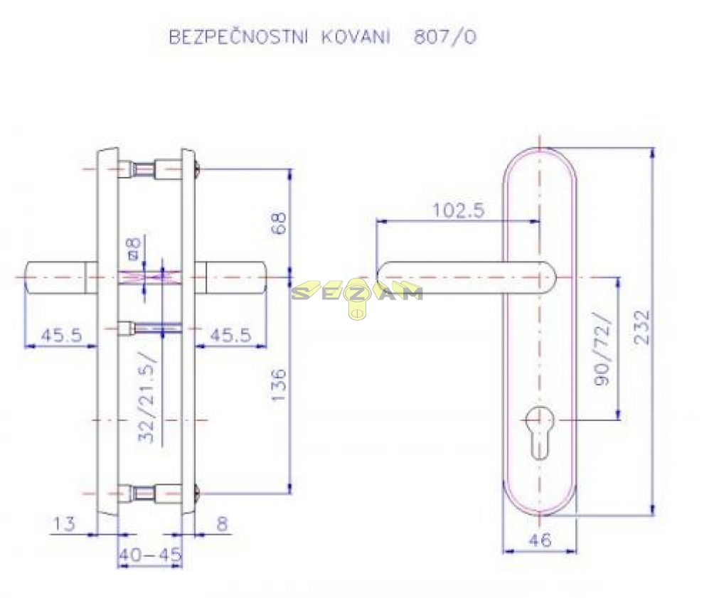 807/O/92/Cr BK K+K – bezpečnostné kovanie 90mm rozteč – vzdialenosť medzi osou kľučky a osou vložky kovania K+K (kľuka a kľuka) Bezpečnostní kování je určeno na vstupní dveře otevírané dovnitř i ven, tloušťka dveří 38-55 mm, dále po 15 mm až do tloušťky dveří 100 mm. Doporučujeme použít cylindrickou vložku ve 3. BT odolnou proti odvrtání.