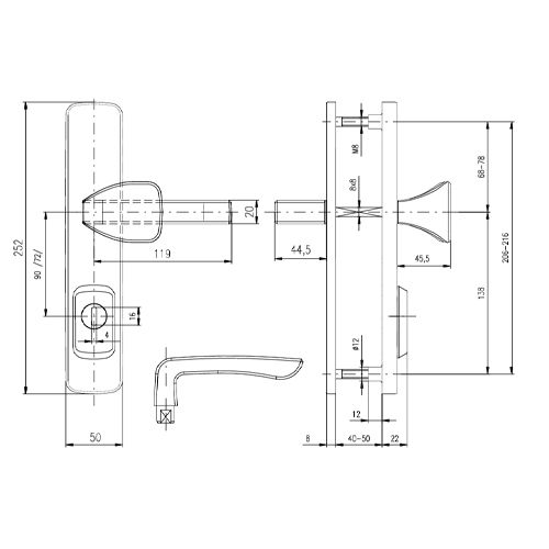 Bezpečnostné kovanie je dodávané bez cylindrickej vložky a je určené na vstupné dvere otvárané dovnútra i von, hrúbka dverí 40 – 50 mm, ďalej po 10 mm až do hrúbky dverí 100 mm.