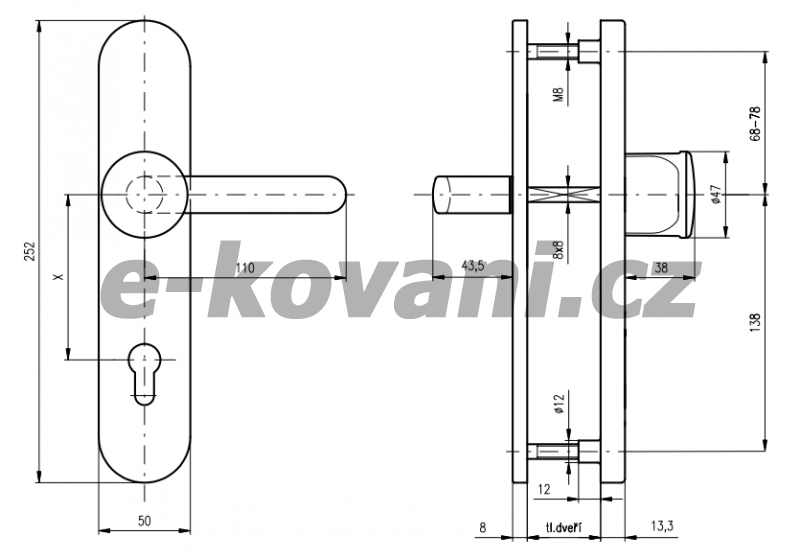 Bezpečnostné kovanie je určené na vstupné dvere otvárané dovnútra i von, hrúbka dverí 38-55 mm, ďalej po 15 mm až do hrúbky dverí 100 mm. Odporúčame použiť cylindrickú vložku v 3. BT odolnú proti odvŕtaniu.