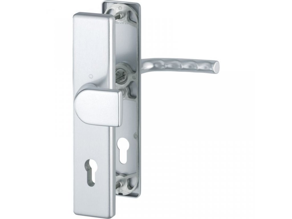 Bezpečnostné kovanie kľučka/guľa bez prekrytia vložky rozetou. Použitie: na vchodové dvere. Materiál: Hliník Farba: F1- strieborná Vhodné pre hrúbku dverí 34-47 mm Vhodné pre pravé aj ľavé dvere. Rozmery: štít: 250 x 54 mm, šírka štítu: 12 mm, kľučka: 124 mm Rozteč: 92 mm Balenie obsahuje montážný materiál.