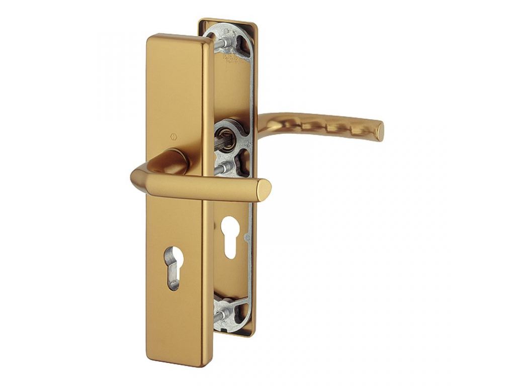 Bezpečnostné kovanie kľučka/kľučka bez prekrytia vložky rozetou. Použitie: na vchodové dvere. Materiál: Hliník Farba: F4- bronzová Vhodné pre hrúbku dverí 34-47 mm Vhodné pre pravé aj ľavé dvere. Rozmery: štít: 250 x 54 mm, šírka štítu: 12 mm, kľučka: 124 mm Rozteč: 92 mm Balenie obsahuje montážný materiál.