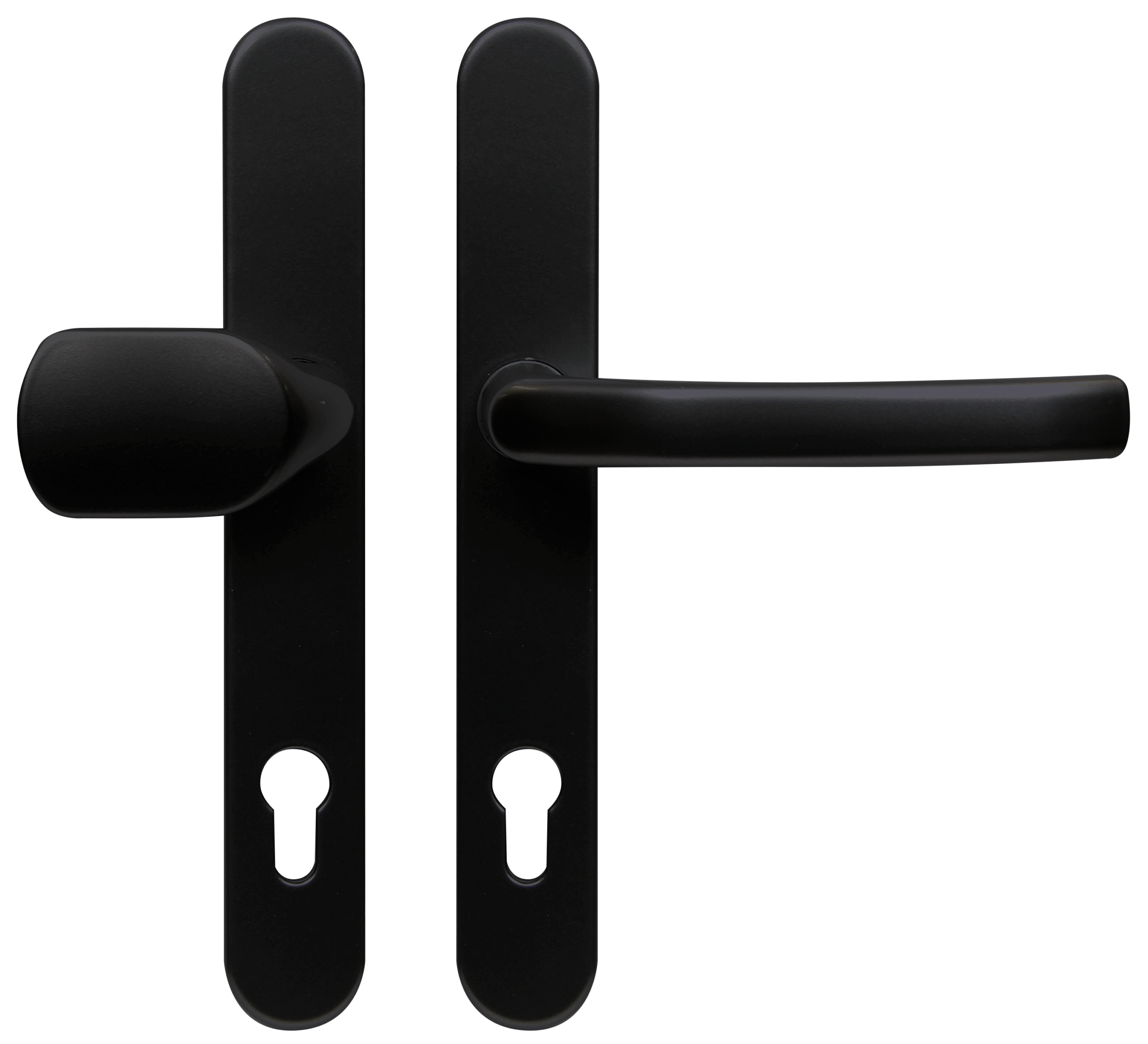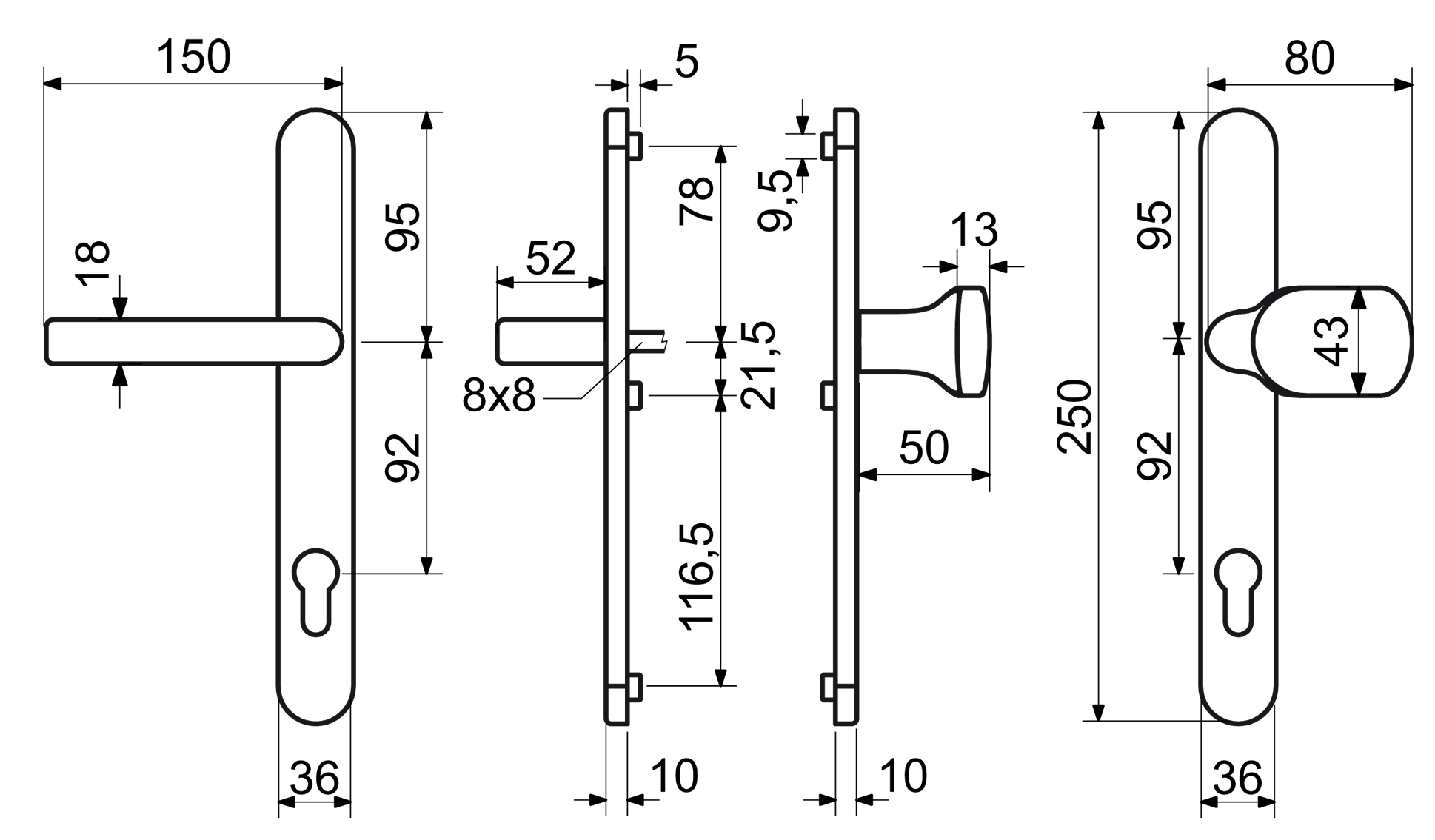 MASIVNÍ HLINÍKOVÉ KOVÁNÍ PRO VSTUPNÍ DVEŘE – MADLO/KLIKA • Klika pevně uložena ve štítu • Zakryté šrouby na vnitřním štítu kování • Vratný mechanismus kliky tvořený čtyřmi pružinami s hranolkem Dodáváno standardně pro tloušťku dveří: • RHD.0030 72 – 92 mm – po zkrácení šroubů, až pro min. 40 mm Rozteč: 92 mm • Balení vč. čtyřhranu 8 x 8 mm, 3 ks spojovacích šroubů M6 x 100 mm a vrtací šablony Hmotnost netto: • RHD.0030 – 0,81 kg, Povrch: F9005 – prášková černá matná