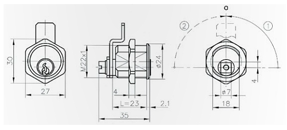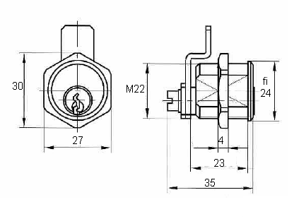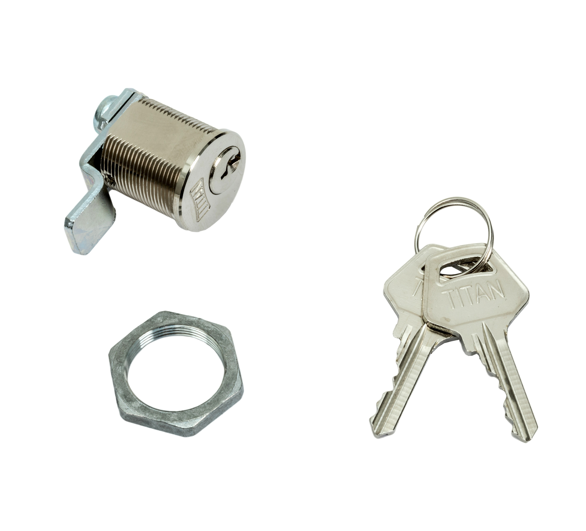 TITAN KO-10 – Nábytkový zámek pro kovové skříňky Tělo a čep – Ni bronz Závora a 2 klíče – Ni ocel Matka M22x1 – Zn slitina Systém klíče – 5 zamykacích pinů = cca 5000 kombinací