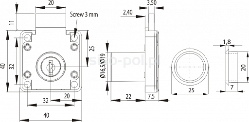 Zámok stolíkový 19x32mm Možnosť aj na master kľúč. Prevedenie nikel Bez protikusu.