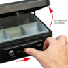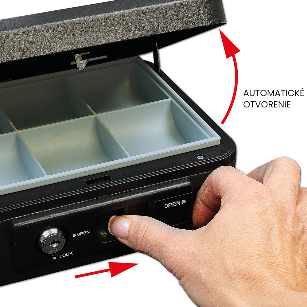 Pokladnička z ocele je vybavená vonkajšou páčkou pre pohodlné automatické otvorenie. Po uzavretí sa sa viko automaticky aretuje.