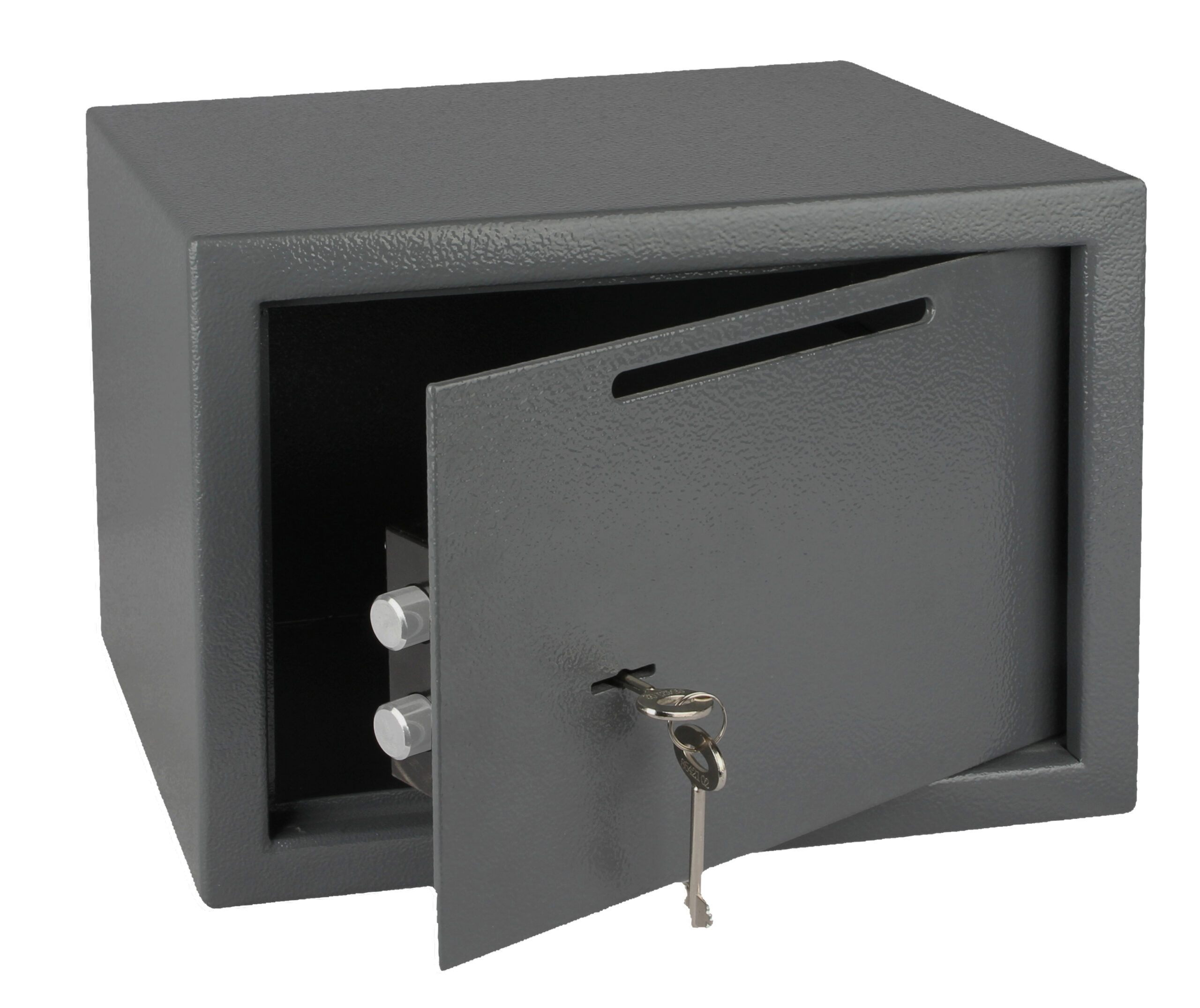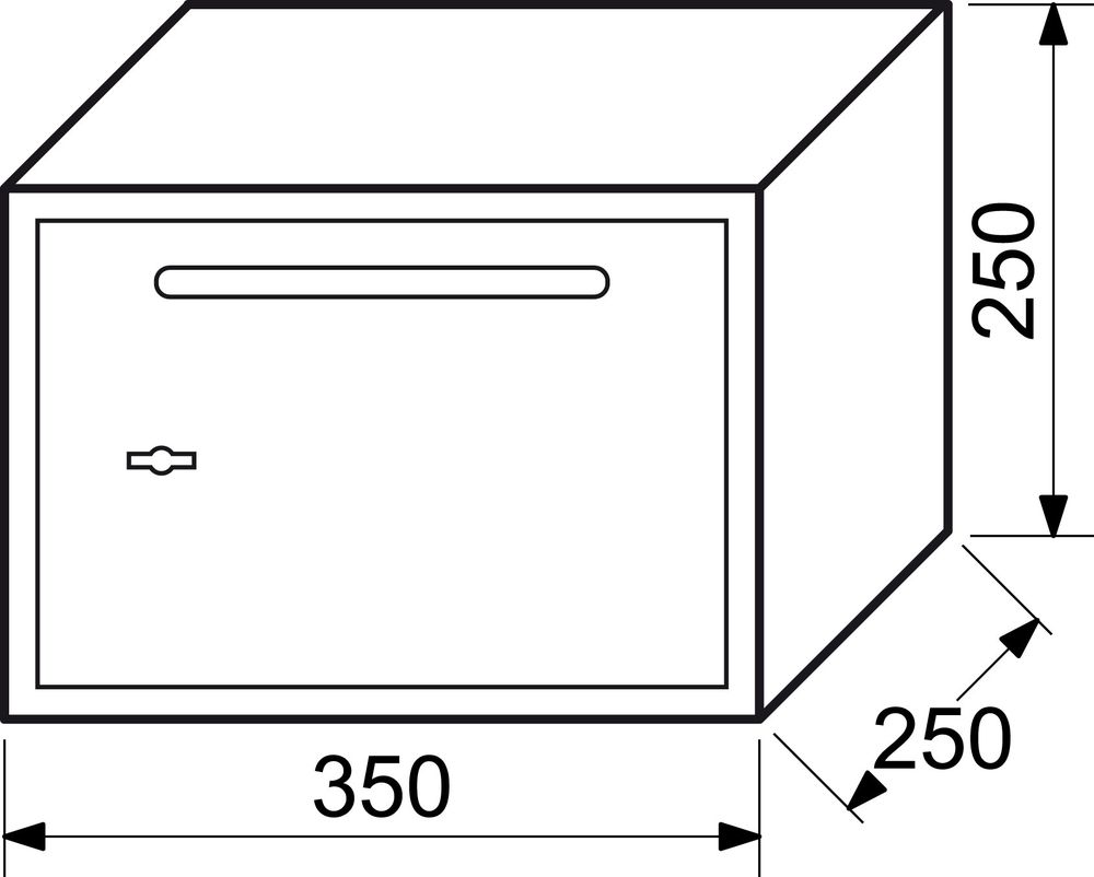 Oceľový trezor s mechanickým zámkom a vhodom. Vonkajšie rozmery: 350x250x250mm (šxvxh) Vnútorné rozmery: 346x246x190mm (šxvxh) Rozmer vhodu: 153x10mm Hmotnosť: 10,2kg, objem: 16L. Sila materiálu: dvere: 4mm, plášť: 2mm Možnosť ukotvenia do steny alebo do podlahy. Balenie obsahuje: oceľové hmoždinky, skrutky a 2ks kľúčov.