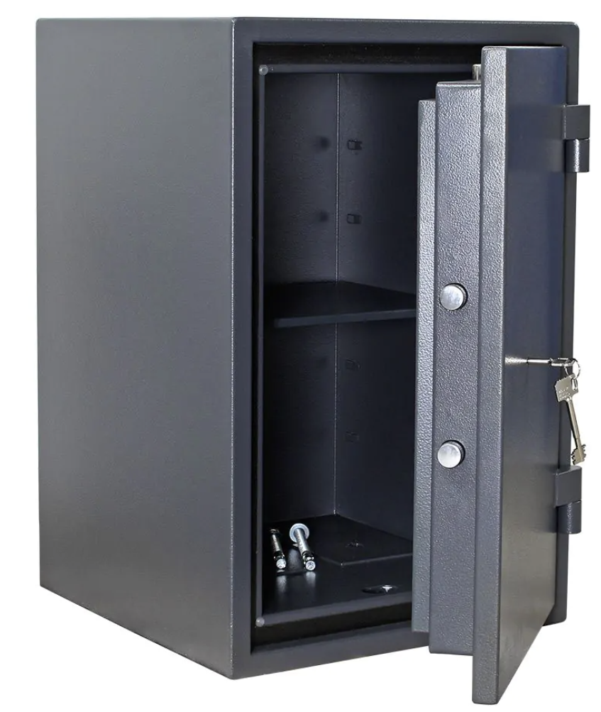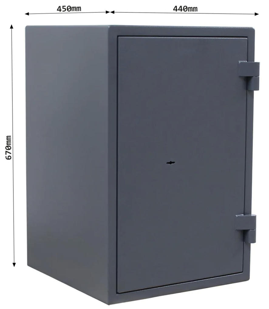 Rottner Fire Hero 65 ohňovzdorný nábytkový trezor antracit Certifikovaný trezorový zámok Bezpečnostná trieda I (ČSN EN 1143-1) Ohňovzdornosť po dobu 30 minút pre papier 3-stranný uzamykací mechanizmus Korpus hrúbky 56 mm a dvere hrúbky 95 mm Nastaviteľná polička vo vnútri Otvorenie dverí až do 180° Otvory na ukotvenie na spodnej strane trezora Vonkajšie rozmery: 670 x 440 x 450 (vxšxh) Vnútorné rozmery: 540 x 329 x 300 mm (vxšxh) Hmotnosť: 99 kg Farba: antracit