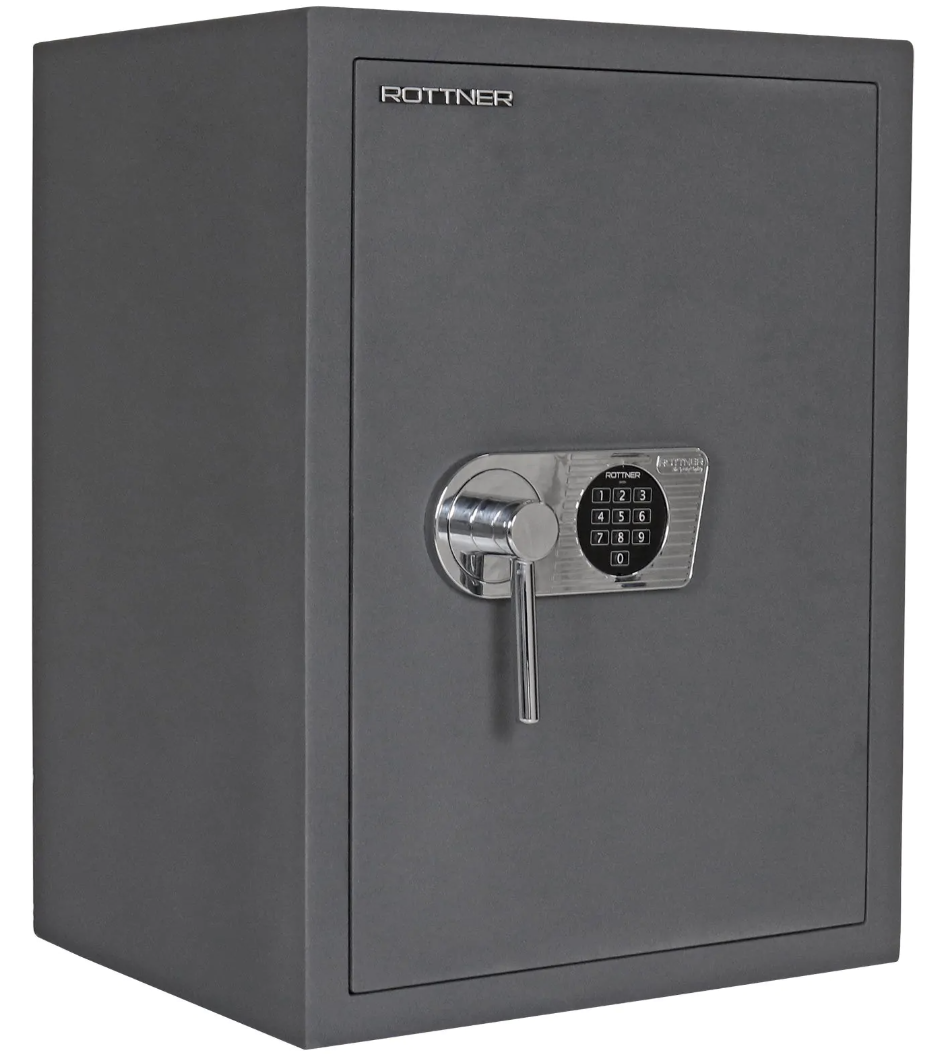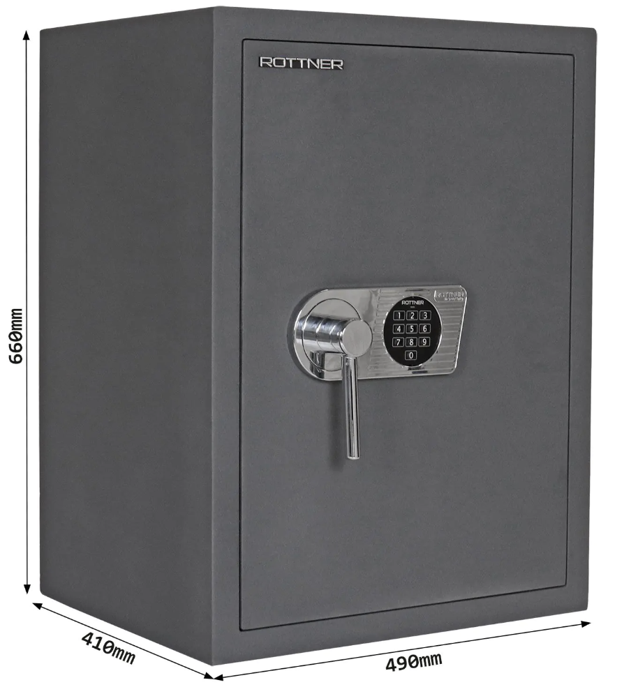 Rottner Toscana 65 EL nábytkový elektronický trezor Certifikovaný elektronický zámok Bezpečnostná trieda I (ČSN EN 1143-1) Napájanie 1 x 9V batériou (nie je súčasťou balenia) Trezor má dvojplášťové dvere s hrúbkou 12 mm Dvere trezora je možné otvoriť v uhle 90° 3-stranný uzamykací mechanizmus Dodávané s 2 vyberateľnými poličkami Otvory na ukotvenie na spodnej a zadnej strane trezora vonkajšie rozmery: 660 x 490 x 410 vnútorné rozmery: 580 x 420 x 310 váha: 94 kg farba: antracit