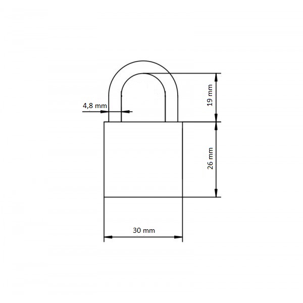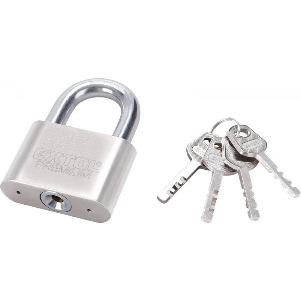 Zámok visiaci kovový, oblý. Povrchvá úprava: matný nikel. Závesné oko z tvrdenej ocele. Dodávaný so 4-mi kľúčmi.