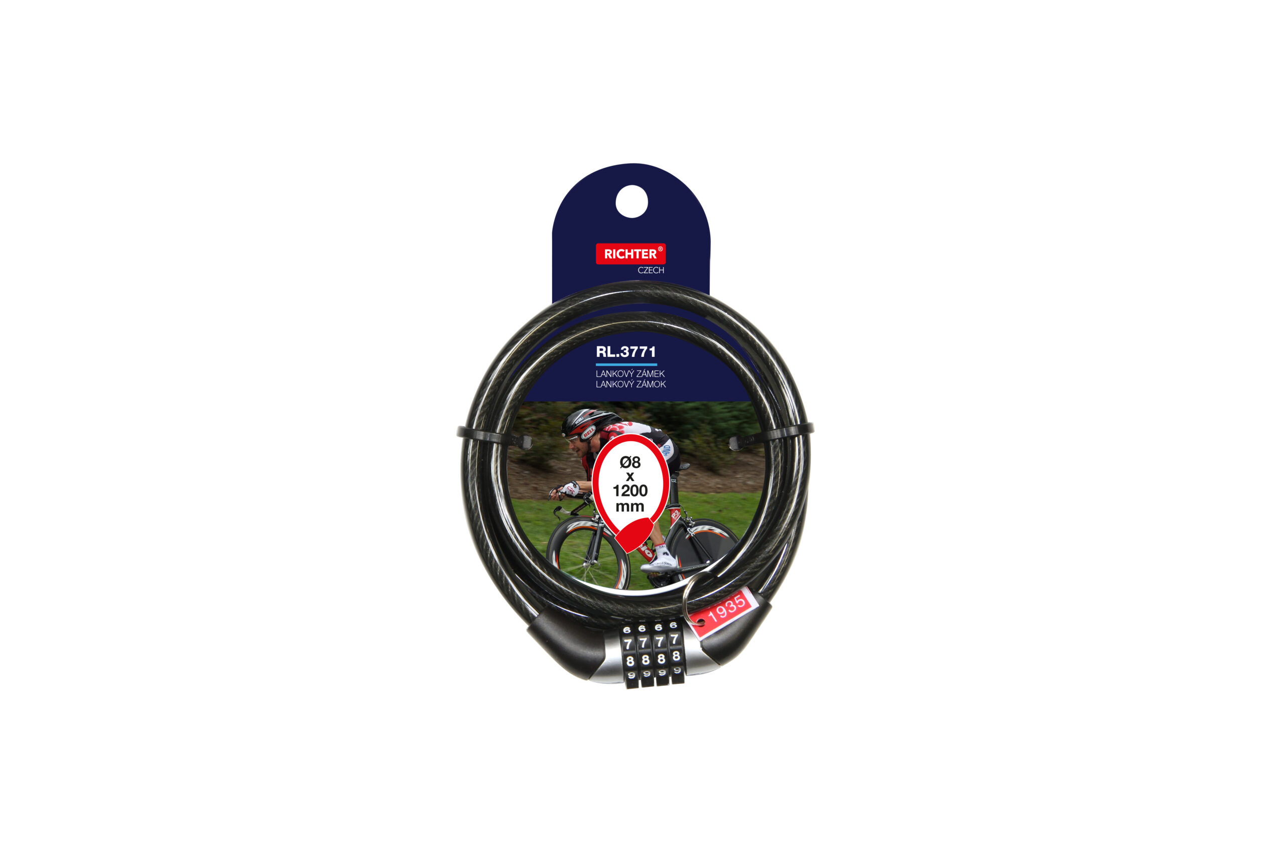 Kódový lankový zámok. Zámok je opatrený prednastaveným kódom. (na obale) 10 000 kombinácií zámku. Farba: čierna Rozmery: dĺžka: 1200mm, priemer: 8mm.