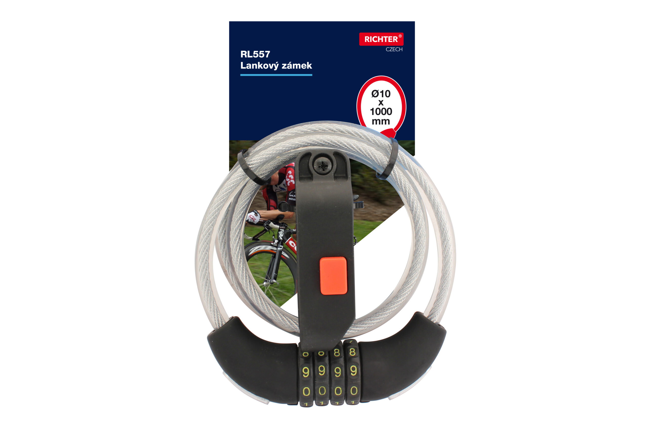Kódový lankový zámok. Súčasťou je držiak na bicykel. 10 000 kombinácií zámku. Rozmery: priemer: 10 mm, dĺžka: 1000 mm Farba: číra
