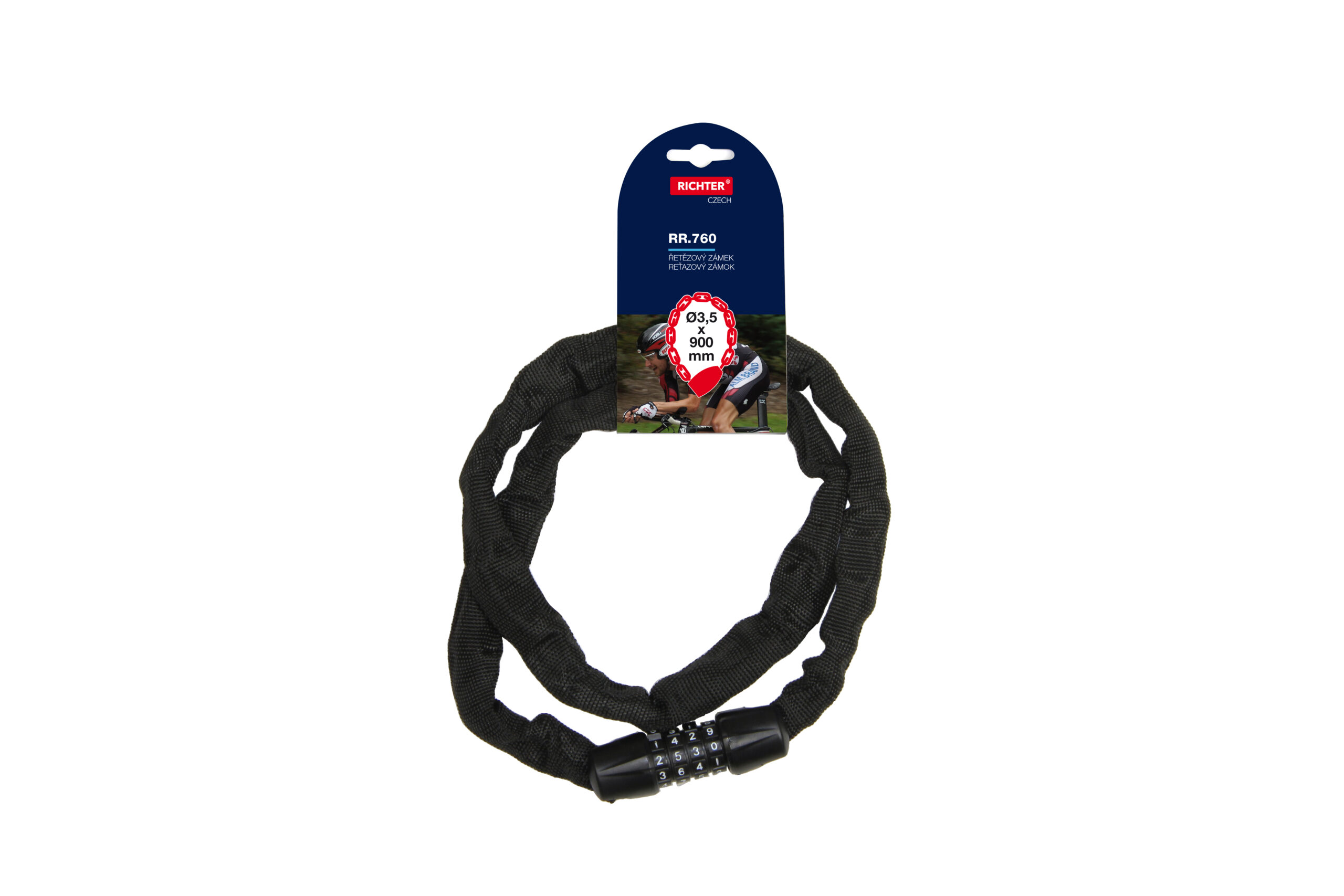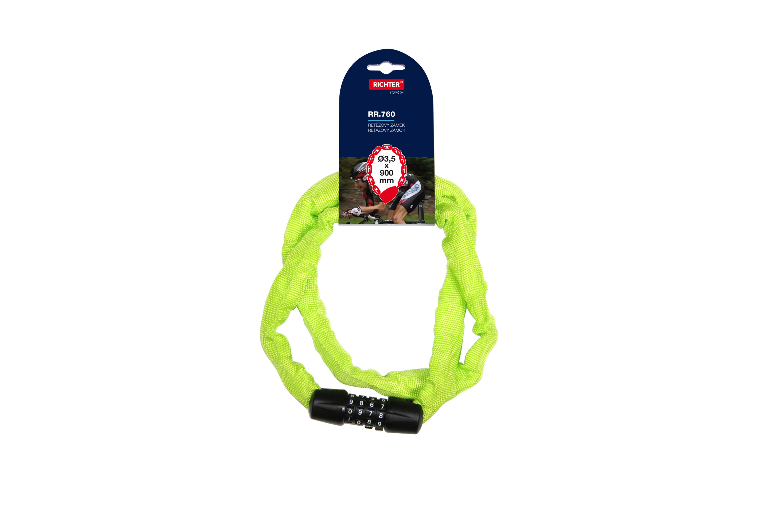 Reťazvý kódový zámok na bicykel. Ochranný kryt z textílie. Nastavenie vlastnej kombinácie, ktorú môžete kedykoľvek zmeniť. 10 000 kombinácií zámku. Farba: čierna, zelená Rozmery: 3,5×900 mm ( priemer x dĺžka)