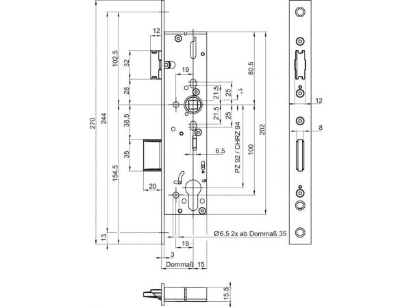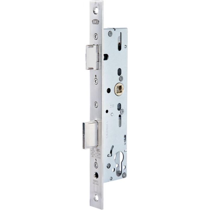 BKS 1314 PZ 92/35/8/24x3x245 Nerez, P/L – Zámek zadlabací vložkový s převodem pravolevý pro rámové dveře kovové nebo hliníkové. Rozteč: 92 mm Hloubka na vložku: 35 mm Celkový zádlab: 40 mm Šířka čela: 24×3 mm Délka čela: 245 mm Čtyřhran: 8 mm Rozměr kapsy: š 37 x v 181 mm