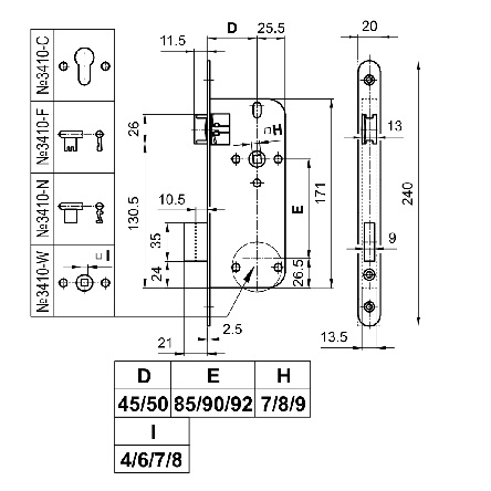 Zadlabávací zámok na vložku Pravoľavý: áno Rozteč: 90 mm Hĺbka zádlabu: 70 mm Šírka čela: 20 mm Dormass: 45 mm Výška čela: 240 mm Povrchová úprava: Nikel