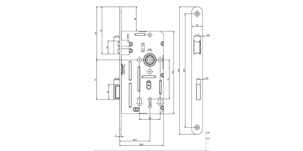 jednozápadový, pravý nebo levý ovládání přes obyčejný klíč zámek bez převodu (střelku nelze ovládat klíčem) určen pro dveře bez zvýšeného nároku na bezpečnost dodáván s jedním klíčem otvory v bočních deskách o průměru 8mm umožňují použítí dvoudílného kování (rozetové) provedení – polochromát Technické parametry: rozteč 72mm, backset 55mm, hloubka zádlabu 80mm šířka čela 20mm nebo 18mm, výška čela 235mm, tloušťka čela 3mm horní ořech nedělený 8mm