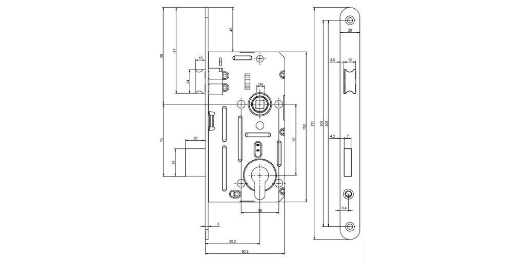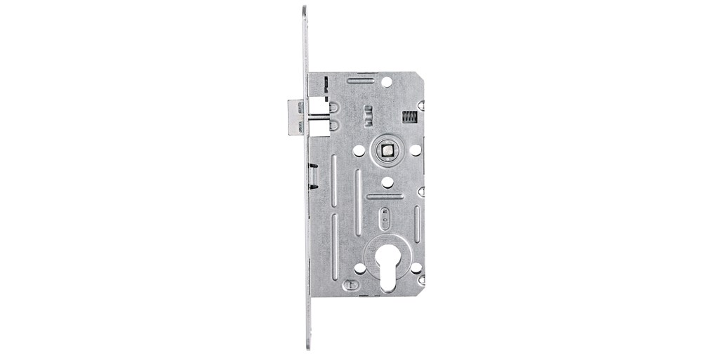 dvouzápadový, pravý nebo levý ovládání přes cylindrickou vložku zámek s převodem (střelku lze ovládat přes cylindrickou vložku) určen pro dveře bez zvýšeného nároku na bezpečnost otvory v bočních deskách o průměru 8mm umožňují použítí dvoudílného kování (rozetové) provedení – polochromát Technické parametry: rozteč 72mm, backset 55mm, hloubka zádlabu 80mm šířka čela 20mm nebo 18mm, výška čela 235mm, tloušťka čela 3mm horní ořech nedělený 8mm