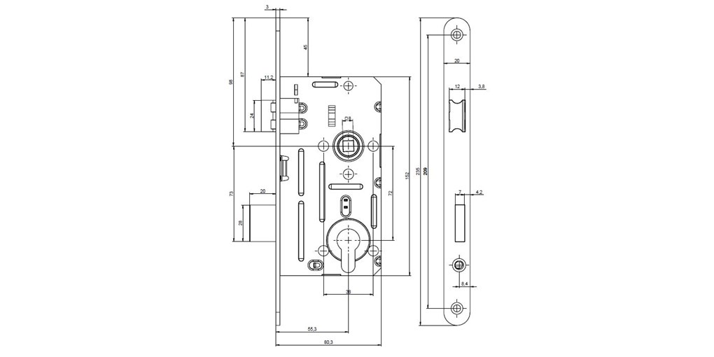 ednozápadový, pravý nebo levý zamknutí zámku přes spodní ořech 6mm nebo 8mm přes WC kličku zámek bez převodu (střelku nelze ovládat spodním ořechem) určen pro dveře bez zvýšeného nároku na bezpečnost otvory v bočních deskách o průměru 8mm umožňují použití dvoudílného kování (rozetové) provedení – polochromát Technické parametry: rozteč 72mm, backset 55mm, spodní ořech 6mm, hloubka zádlabu 80mm, rozteč 78mm, backset 55mm, spodní ořech 8mm, hloubka zádlabu 80mm šířka čela 20mm nebo 18mm, výška čela 235mm, tloušťka čela 3mm horní ořech nedělený 8mm