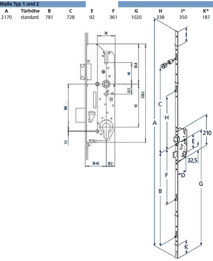 FUHR 855GL-1/1 65/92/8/16x3x2170 – Lištový zámek zadlabací se 4 válečky Rozteč klika/vložka 92 mm Hloubka na vložku (dornmass) 65 mm Celková délka lišty 2170 mm Čtyřhran pro kliku 8 mm Šířka čela 16 mm Protikusy NEJSOU součástí.