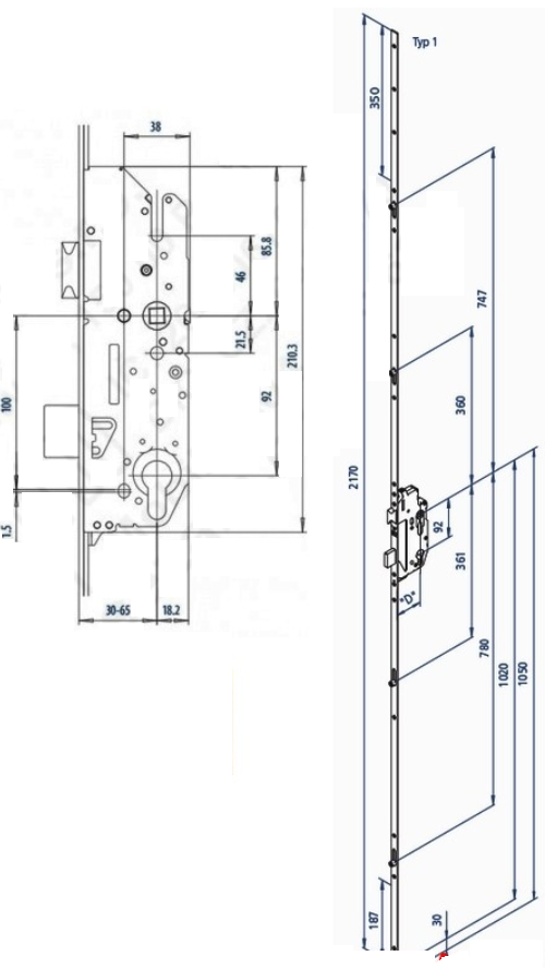 FUHR 856GL-1/1 55/92/8/16x3x2170 – Lištový zámek zadlabací se 4 válečky, zamykání klikou Rozteč klika/vložka 92 mm Hloubka na vložku (dornmass) 55 mm Celková délka lišty 2170 mm Čtyřhran pro kliku 8 mm Šířka čela 16 mm Protikusy NEJSOU součástí.