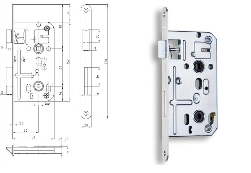 Stavebný zadlabací zámok na wc Zámok je možné meniť na pravý a ľavý- je univerzálny Rozteč: 72mm Hĺbka zádlabu: 80mm Šírka čela: 20mm Dormass: 50mm Výška čela: 220mm Spodný orech: 6x6mm Povrchová úprava: biely Zn