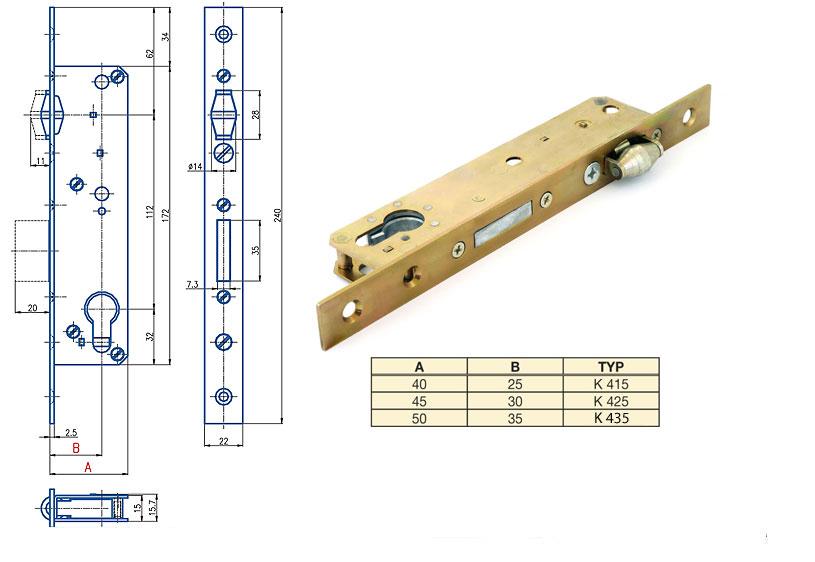 Osová vzdálenost (backset): 25 mm Celkový zádlab: 40 mm Šířka čela: 22 mm Výška čela: 240 mm