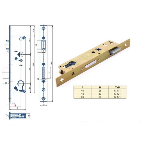 K 431 zadlabávací zámok, jednozápadový s prevodom HOBES. Zámok je s protiplechom. 90mm rozteč 50mm zádlab 35mm dornmass Alternatíva EUROPORTAL S50/90/22.