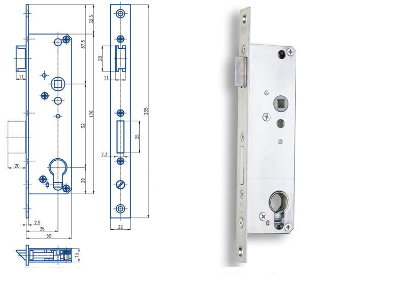 Zadlabavací zámok jednozápadový s prevodom, na vložku. Pravoľavý: áno Rozteč: 92mm Dormass: 35mm Hĺbka zádlabu: 50mm Šírka čela: 22mm Výška čela: 235mm
