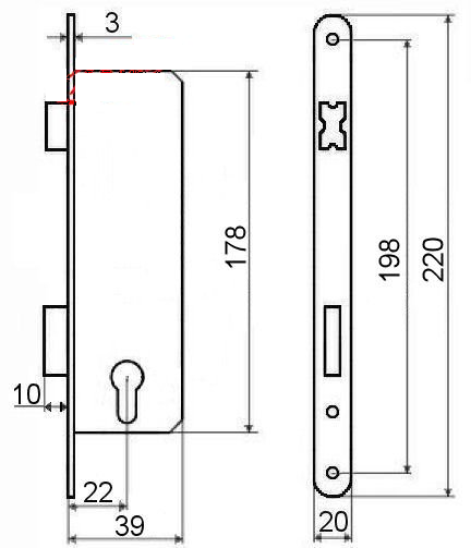 Zadlabávací zámok na vložku, miesto strelky má valček Pravoľavý: áno Rozteč: 90 mm Hĺbka zádlabu: 39 mm Šírka čela: 20 mm Dormass: 22 mm Výška čela: 220 mm Rozmer kapsy: 39×178,5 mm (š x v)