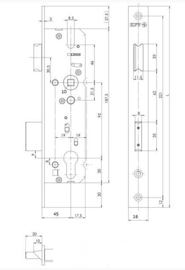Zámok s cylindrickou vložkou pre cylindrickú vložku KFV 49 92/45/8/16x245x3 P/L s jednoduchou západkou s prevodom.