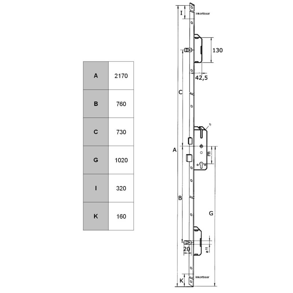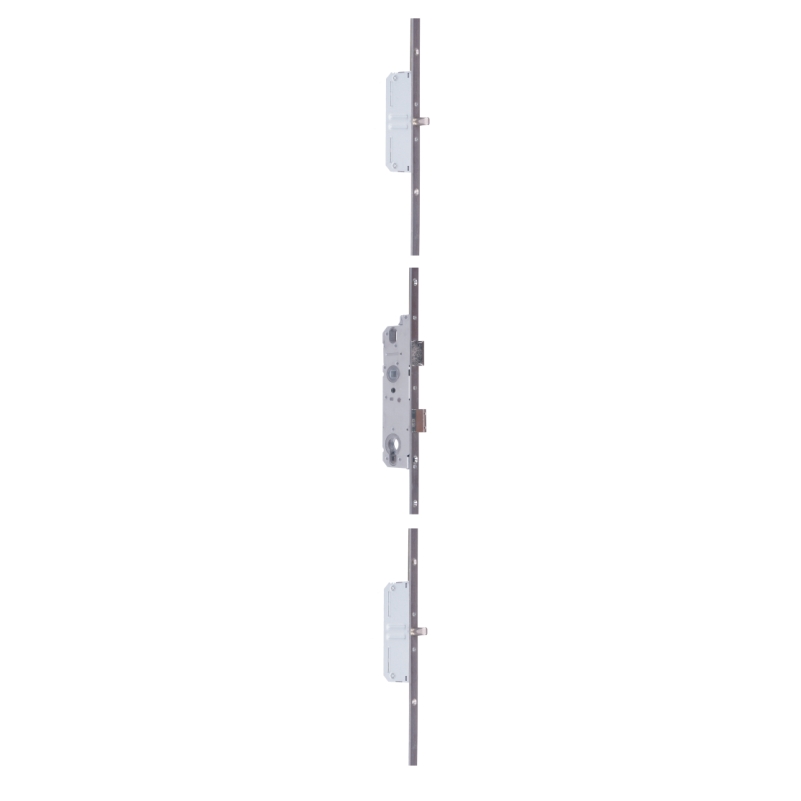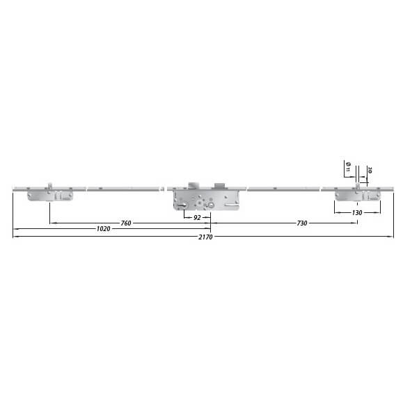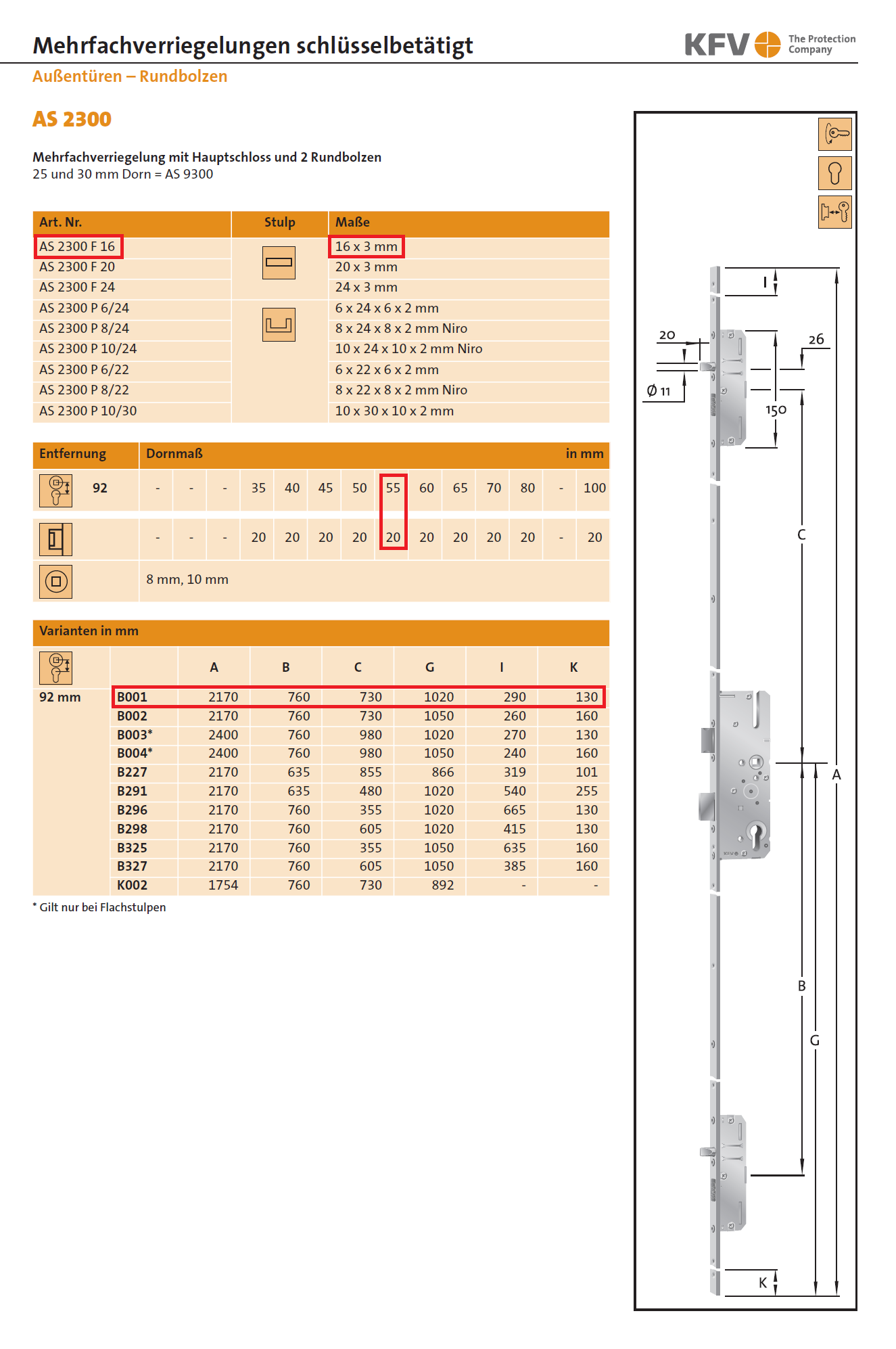 KFV AS 2300F 55/92/8/16/2170 Pzn – Lištový zámek zadlabací se 2 kolíky BEZ PROTIKUSŮ Rozteč klika/vložka 92 mm Hloubka na vložku (dornmass) 55 mm Čtyřhran pro kliku 8 mm Celková délka lišty 2170 mm Šířka čela 16×3 mm Výška B: 760 mm Výška C: 730 mm – 2 masivní čepy "Kopibo" proti vypáčení – 2 vytvrzené ocelové prvky pro vyšší pevnost – s ochranou proti přepilování hlavního zámkového uzávěru proti násilnému vniknutí – silný převod pro silné utěsnění uzavření – střelka s jemným uzamykáním – DIN levé/pravé použití – Systém vícenásobného uzamykání ovládaný cylindrickou vložkou – Ovládání hlavního zámku a přídavných závěrových bodů se uskutečňuje pomocí pohybu klíče v cylindrické vložce. – Otáčením klíčem je uveden do pohybu převod, který posunuje západku a přídavné závěrové body. – Aby bylo možné uzamčené dveře hlavního zámku snadno otevřít, zasune převod při odemknutí dveří současně zpět i střelku. – Obvykle jsou dveře osazeny zevnitř klikou a zvenčí madlem, takže zvenku je možné dveře otevřít pouze klíčem. Tento způsob ovládání je nejvíce rozšířen ve střední Evropě včetně jižní a východní Evropy.