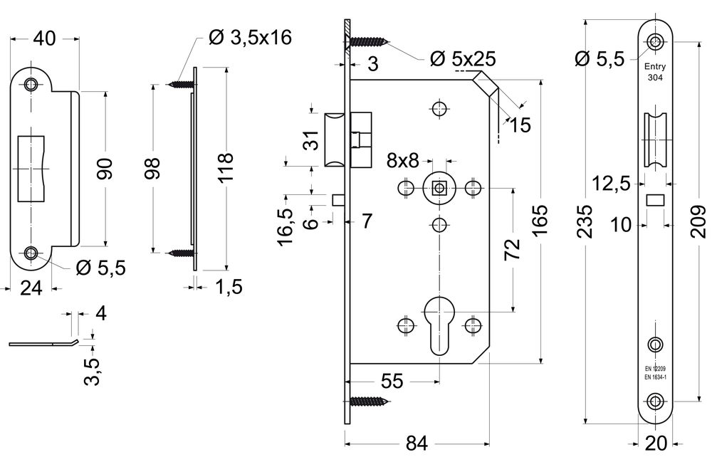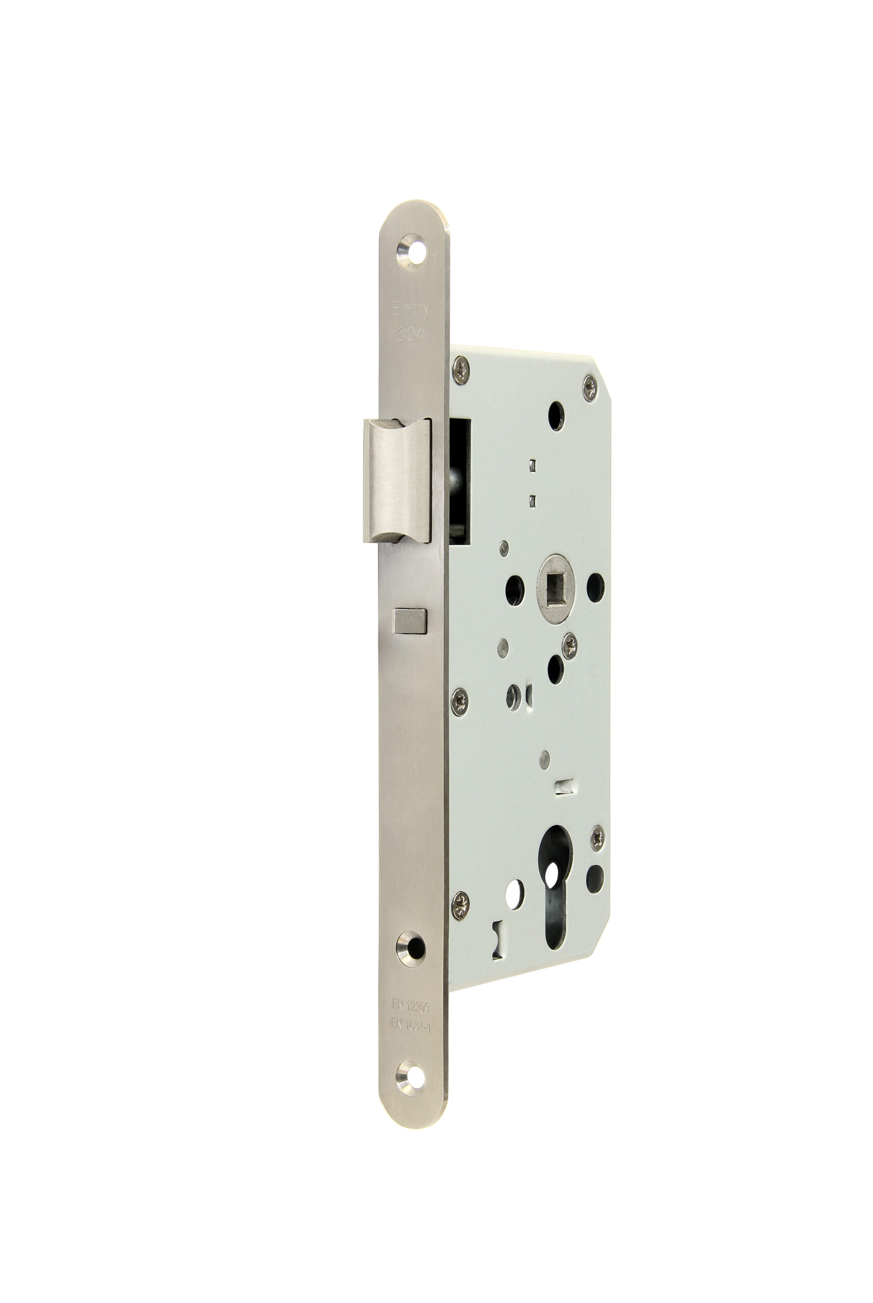 Zadlabavací strelkový zámok s funkciou blokovania strelky a pánikovou funkciou "D". Pre kovanie kľučka/kľučka. Strelka je blokovaná ako pri zámku 304.BS. Funkcia "D": Po uzamknutí zámku kľúčom je vonkajšia kľúčka nefunkčná, nedá sa stlačiť. Zámok je ovládateľný len z vnútornej strany. V odomknutom stave je zámok ovládateľný z oboch strán. Výhoda oproti štandardnému pánikovému závorovému zámku je,že po prechode dvermi je zámok stále zamknutý. Strelka obojstranná-pravoľavá s prevodom. Delený orech. Balenie obsahuje: protiplech, delený štvorhran 8x8x50mm a 4ks skrutiek.