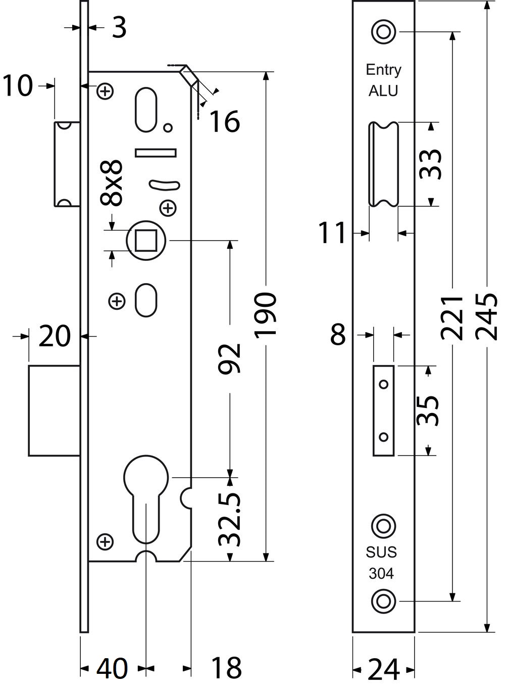 Zadlabávací zámok určený pre plastové dvere. Schránka zámku z pozinkovaného plechu o sile 1,5 mm. Strelka obojstranná-pravoľavá s prevodom. Jednozápadová závora. Čelo: 24 mm z lesklej ocele.