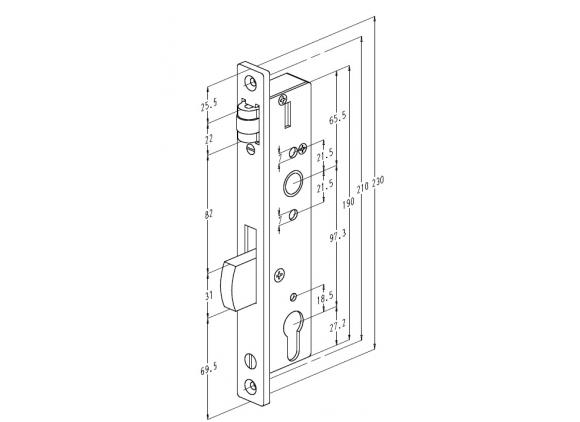 SOBINCO/REYNAERS 8011-25 PZ 0/28/0/23,5 P/L – Zámek zadlabací, váleček+výklopná závora. Rozteč: 0 Hloubka na vložku: 28 mm Celkový zádlab: 43,5 mm Šířka čela: 23,5×5,5 mm Délka čela: 230 mm Čtyřhran: 0 mm Rozměr kapsy: š 38 x v 190 mm