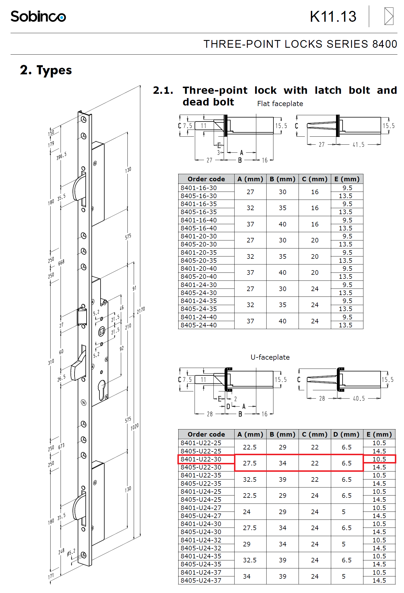 REYNAERS/SOBINCO 8401-U22-30 PZ 92/34/8/U22/2170 P/L – Tříbodový lištový zámek s výklopnými závormi. Rozteč: 92 mm Hloubka na vložku: 34 mm Celkový zádlab: 50 mm Šířka čela: U22x6,5 mm Délka čela: 2170 mm Čtyřhran: 8 mm Rozměr kapsy: š 48 x v 210 mm REYNAERS 617654ZC