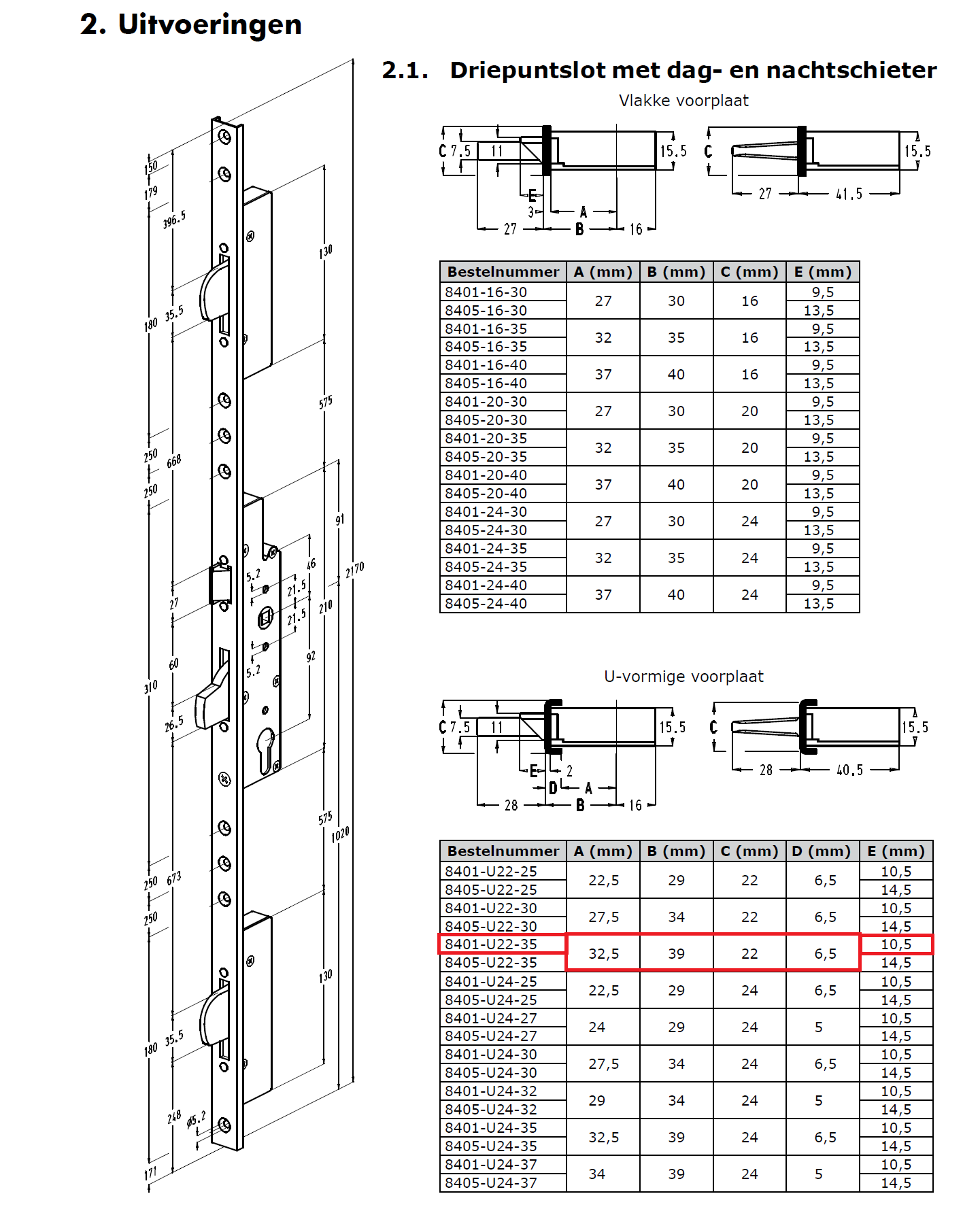 REYNAERS/SOBINCO 8401-U22-35 PZ 92/39/8/U22/2170 P/L – Tříbodový lištový zámek s výklopnými závormi. Rozteč: 92 mm Hloubka na vložku: 39 mm Celkový zádlab: 50 mm Šířka čela: U22x6,5 mm Délka čela: 2170 mm Čtyřhran: 8 mm Rozměr kapsy: š 48 x v 210 mm