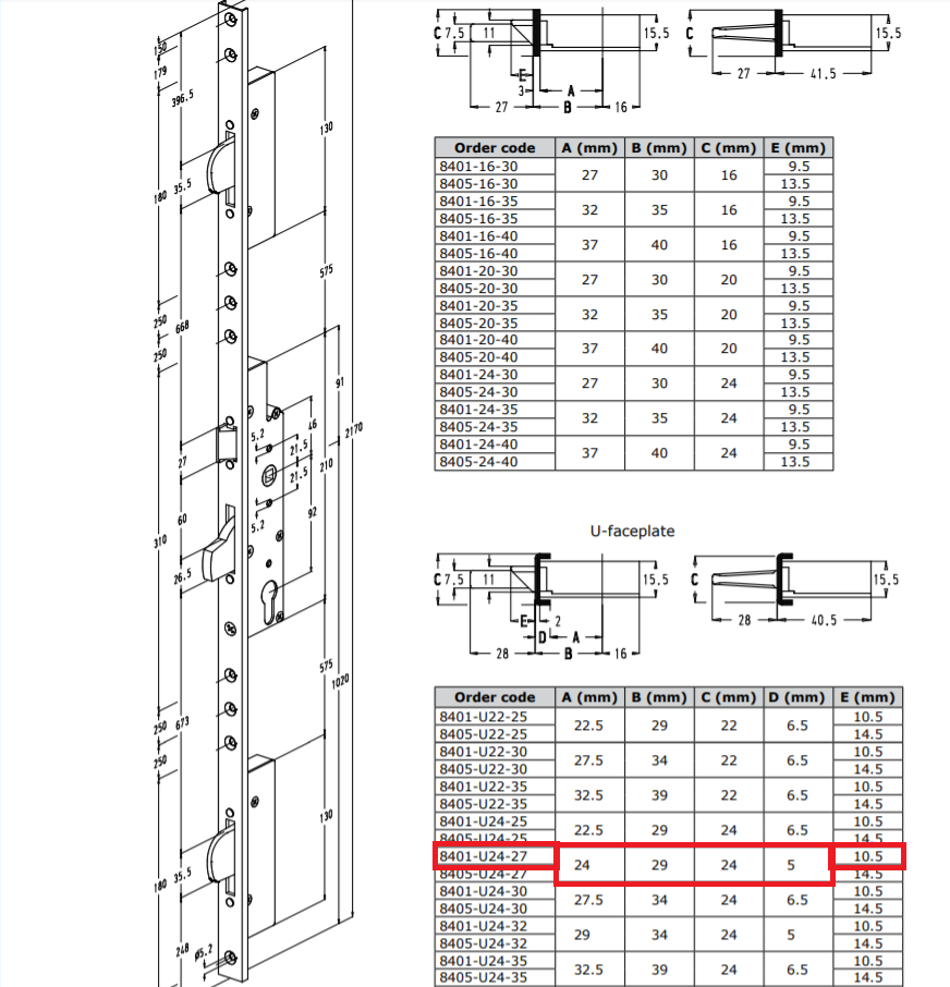 REYNAERS/SOBINCO 8401-U24-27 PZ 92/29/8/U24x5x2170 P/L – Tříbodový lištový zámek s výklopnými závormi. Rozteč: 92 mm Hloubka na vložku: 29 mm Celkový zádlab: 40,5 mm Šířka čela: U24x5 mm Délka čela: 2170 mm Čtyřhran: 8 mm Rozměr kapsy: š 48 x v 210 mm REYNAERS