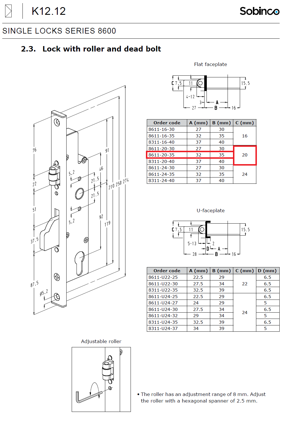 SOBINCO/REYNAERS 8611-20-35 PZ 0/35/0/20 P/L – Zámek zadlabací, váleček+výklopná závora. Rozteč: 0 mm Hloubka na vložku: 35 mm Celkový zádlab: 51 mm Šířka čela: 20×3 mm Délka čela: 274 mm Čtyřhran: 0 mm Rozměr kapsy: š 52 x v 210 mm