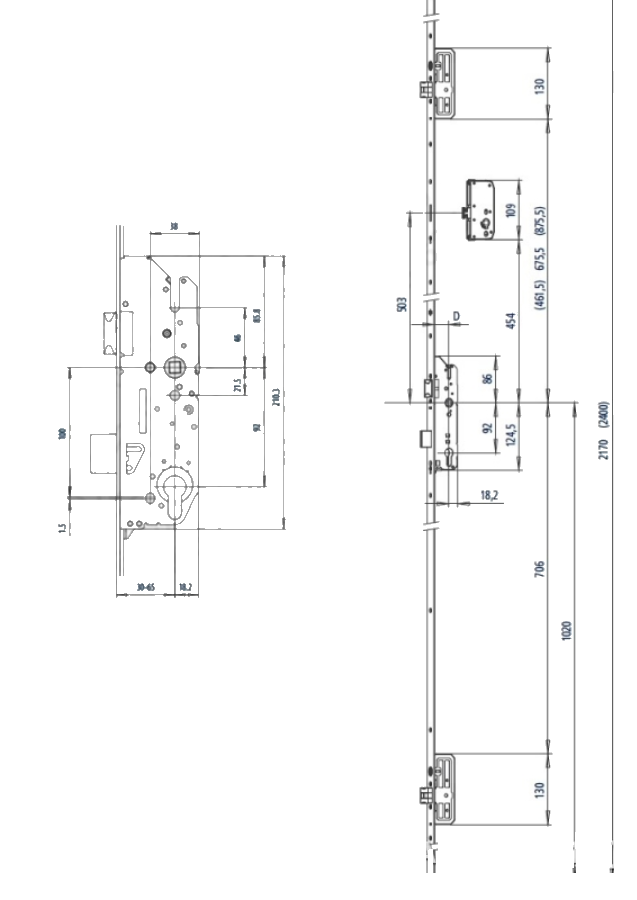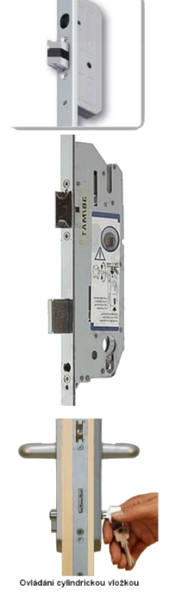 FUHR 833 35/92/8/16/2170 – Lištový zámek samozamykací. PROTIKUSY NEJSOU SOUČÁSTÍ DODÁVKY. eč klika/vložka 92 mm Hloubka na vložku (dornmass) 35 mm Čtyřhran pro kliku 8 mm Celková délka lišty 2170 mm Šířka čela 16×3 mm Horní kapsa: 675,5 mm Spodní kapsa: 706 mm Vlastnosti: – 2 masivní západky proti vypáčení – Ochrana proti přepilování hlavního zámkového uzávěru proti násilnému vniknutí – Střelka s jemným uzamykáním – DIN levé/pravé použití – Automatické zamykání horní a spodní západky magneticky – Závora zámku není zamykána automaticky, ale otočením klíče ve vložce – Pokud je zámek uzamčen klíčem, pak je mechanismus panikového odemykání klikou zablokován – Odemykání hlavního zámku a přídavných závěrových bodů se uskutečňuje pomocí pohybu klíče v cylindrické vložce. – Otáčením klíčem je uveden do pohybu převod, který posunuje západku a přídavné závěrové body. – Aby bylo možné uzamčené dveře hlavního zámku snadno otevřít, zasune převod při odemknutí dveří současně zpět i střelku. – Obvykle jsou dveře osazeny zevnitř klikou a zvenčí madlem, takže zvenku je možné dveře otevřít pouze klíčem. Tento způsob ovládání je nejvíce rozšířen ve střední Evropě včetně jižní a východní Evropy.