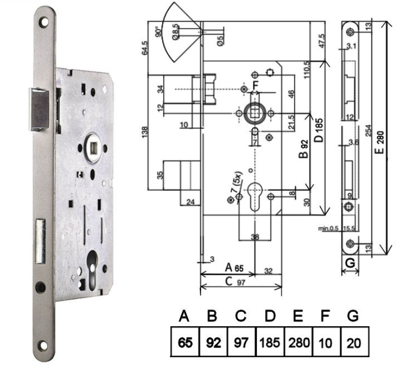 Rozteč: 92 mm Hloubka na vložku: 65 mm Celková hloubka: 97 mm Čelo: 20 x 3 x 280 mm Povrchová úprava slitina Zn.
